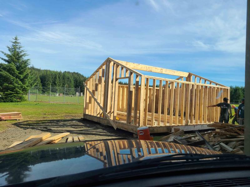 Striped dining hall exterior, replacing rotting wood as needed and prepping for new paint. Wired a new missionary staff house and built recreation equipment outbuilding.